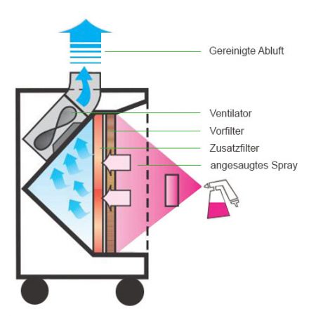Der fahrbare Farbspritzstand Mobilspray besteht aus einer vollverzinkten Blechkonstruktion mit PA-Rollen und funkengeschütztem Laufrad.